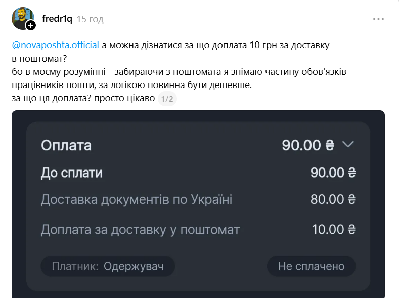 Что получение отправки в почтомате стоит на 10 гривен дороже, чем в отделении, написал один из пользователей соцсети Threads. Он удивляется, потому что по логике пользование почтоматом наоборот должно быть дешевле, ведь с операторов на отделениях снимается часть обязанностей.