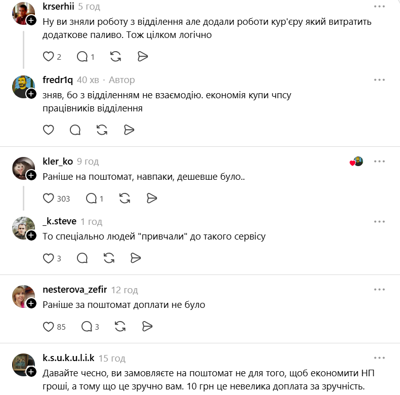 Некоторые комментаторы возмущаются такой системой. Ожидают, что НП и дальше будет увеличивать доплату за пользование почтоматом. В то же время некоторым это кажется разумным, ведь курьер тратит на доставку в почтомат дополнительное горючее. Вот некоторые из комментариев: