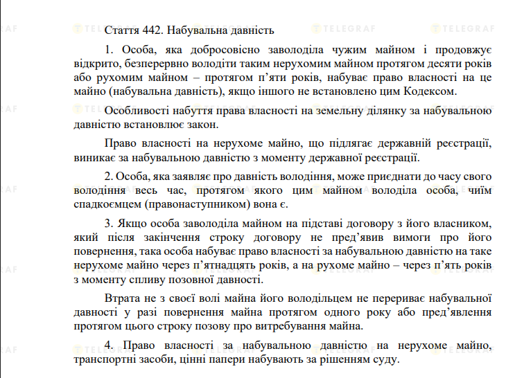 Депутат Киевсовета Виктория Пташник отмечает — в кодексе закрепляется, что если кто-то завладел чужим недвижимым имуществом и продолжает им владеть 10 лет, то он приобретает право собственности на это имущество. "Захватили участок в лесу, прошло 10 лет, и никакие решения не требуются (ст. 442) + узаконивание всех незаконных передач в частную собственность земельных участков и архитектурных объектов. Например, застроили подход к реке своими имениями — продали имение "добросовестному приобретателю" вместе с подходом к воде и, вуаля, все узаконено. Это же касается и объектов архитектуры и культурных памятников (ст. 495 ГК)", — объясняет она лазейку. Также вводится понятие "владение" — в случае физического контроля над объектом, то есть захватить что-то и удержать его от других — дает право на приобретение права собственности, несмотря на наличие реального собственника (ст. 568-591).