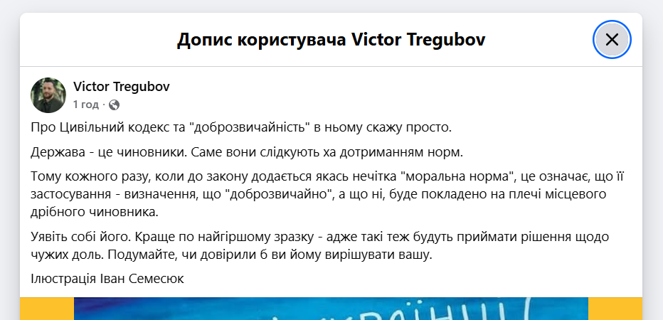 На опасность и потенциальные коррупционные риски указывает и публицист, спикер ОСУВ "Хортица" и соучредитель партии "Демократична Сокира" Виктор Трегубов. Он подчеркивает, что по применение нечетких моральных норм возлагается на местных мелких чиновников. "Представьте себе его. Лучше по худшему образцу — ведь такие тоже будут принимать решения относительно чужих судеб. Подумайте, доверили бы вы ему решать вашу", — пишет он.