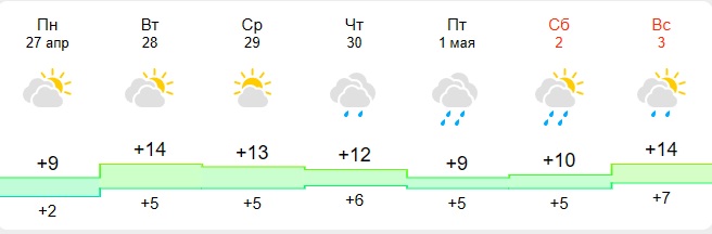 Согласно данным сервиса, начало недели (27 апреля — 3 мая) будет влажным и ветреным, а самым "неприятным" днем может стать понедельник, из-за сочетания влаги и холодного ветра. Однако точка перелома в холодной погоде может наступить уже 30 апреля, когда солнце начнет работать в полную силу, и дневная температура уверенно пересечет отметку +15 градусов. К 3 мая столбики термометров, по этому прогнозу, достигнут +12+25 градусов.