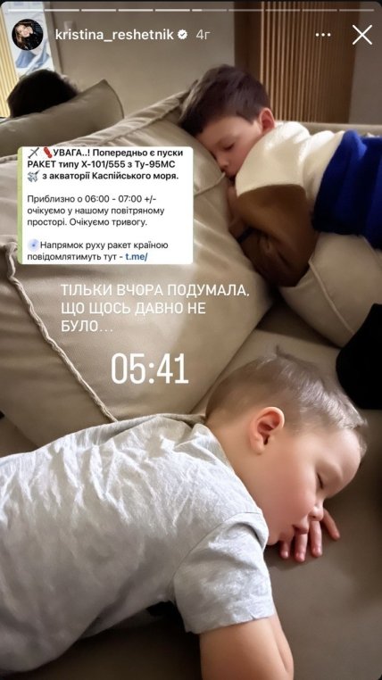 Блоггерша поделилась фото двух меньших детей в 05:41. Также супруга шоумена сказала, что за время войны уже научилась различать виды ракет.